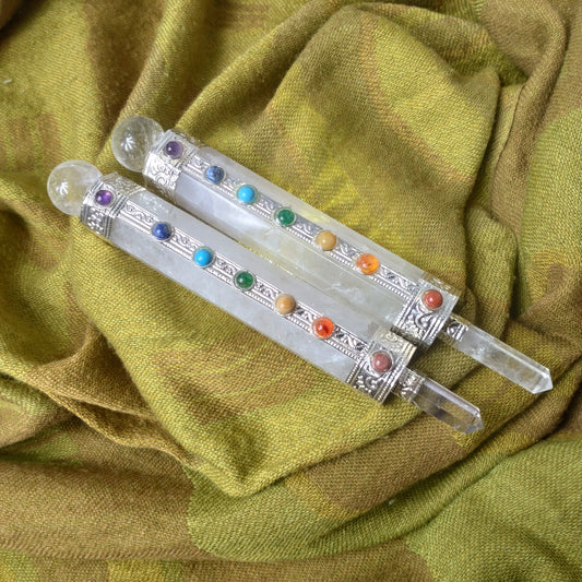 Trollstav, (Magic Wand), i trä med Bergkristall i båda ändar