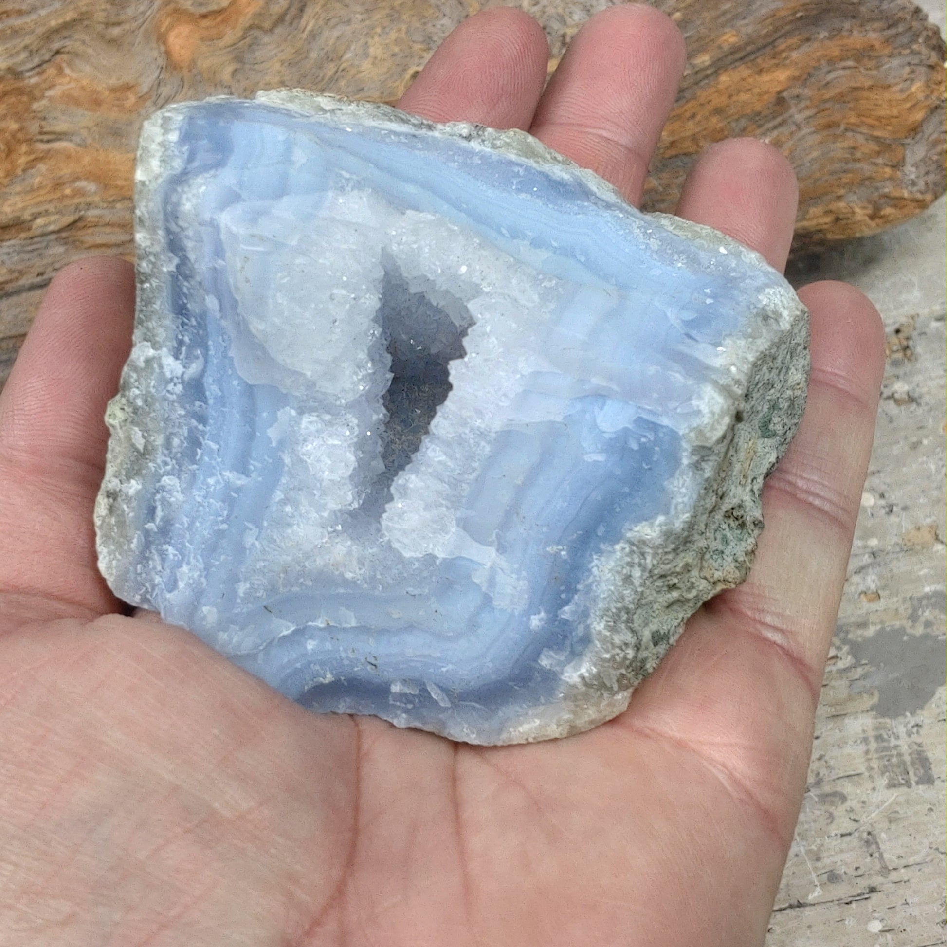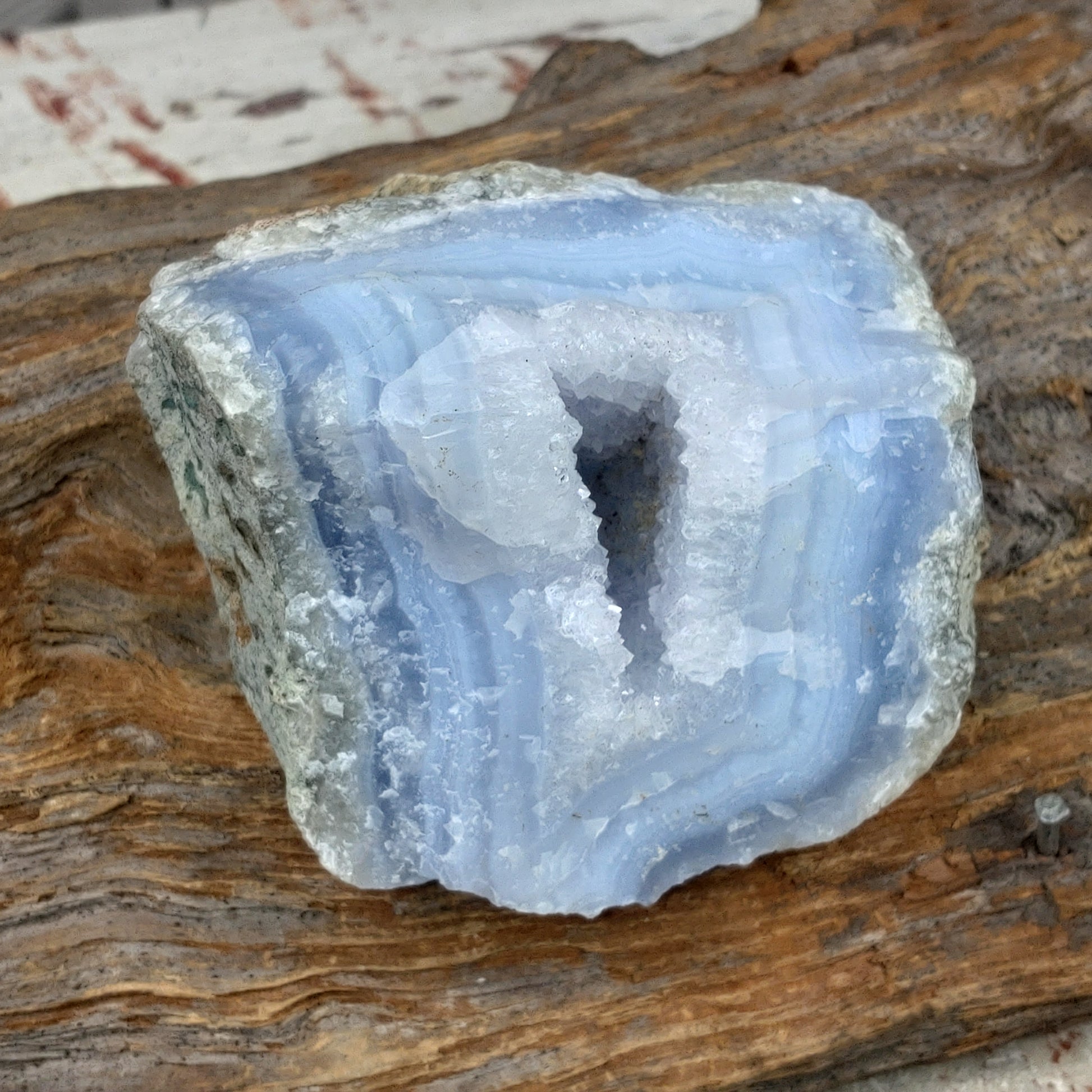 Blå Bandagat är känd för att vara en mycket lugnande och vårdande sten som sägs bär på rogivande energier som stillar ett oroligt och stressat sinne. Den påstås kunna balansera känslor genom att lugna och dämpa ilska, samt stilla nervositet.