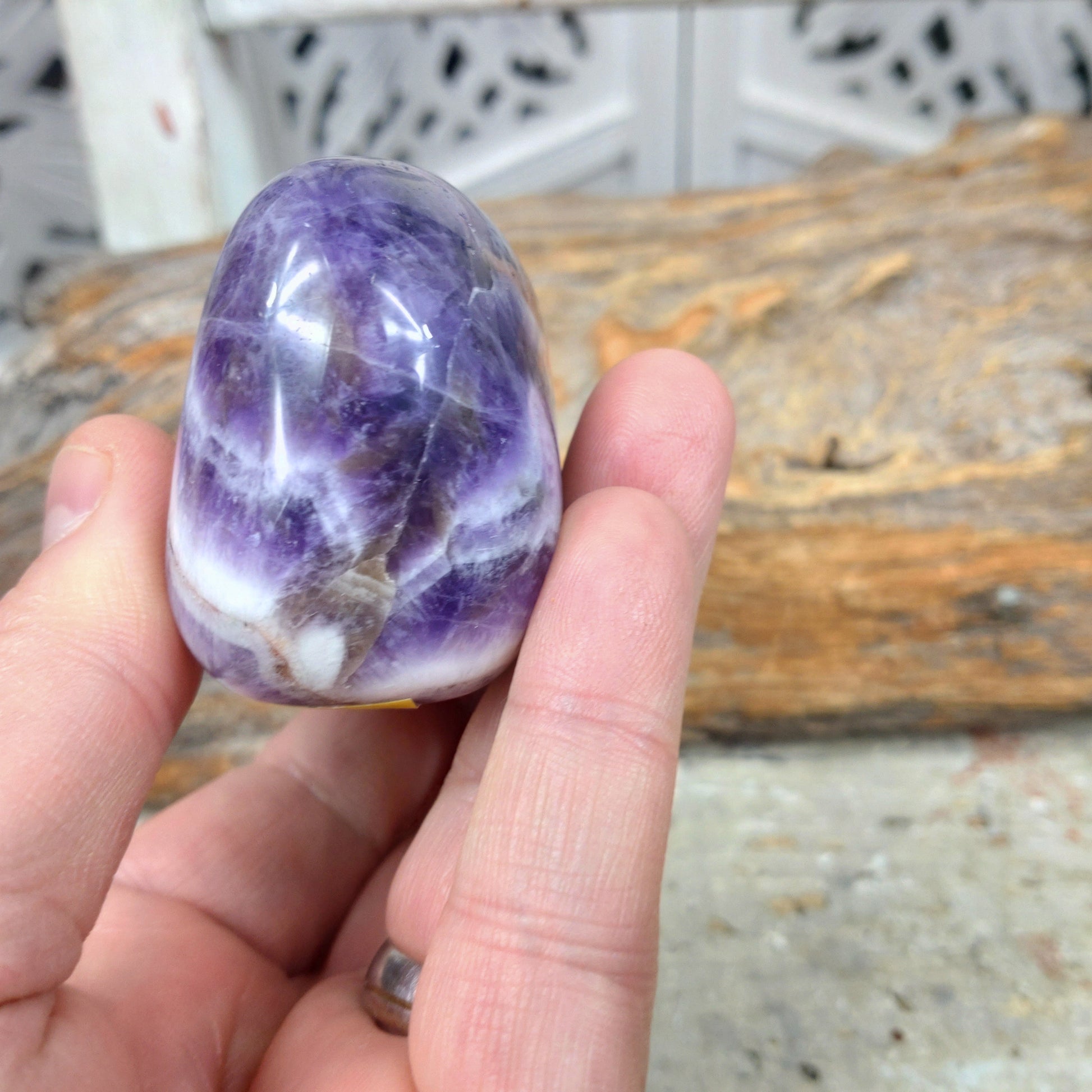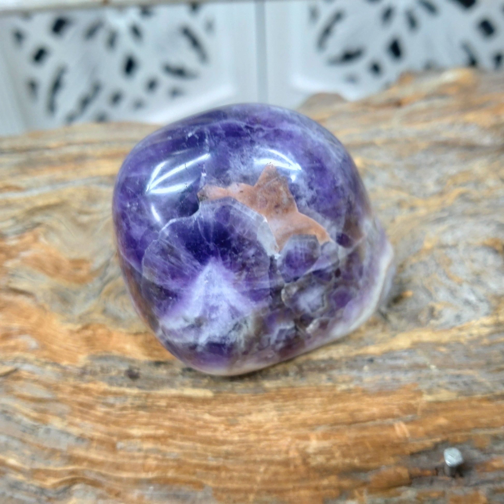 Chevron ametist är en sten med egenskaperna att förstärka intuition och psykiska förmågor, samt att skydda mot negativ energi och främja andlig tillväxt och lugn. Den är en kombination av ametist och vit kvarts, vilket ger den unika bandmönster och kombinerar ametistens lugnande effekter med kvartsens renande och stärkande egenskaper. Den används ofta i meditation för att öka klarhet och för att hjälpa till att släppa negativa mönster.