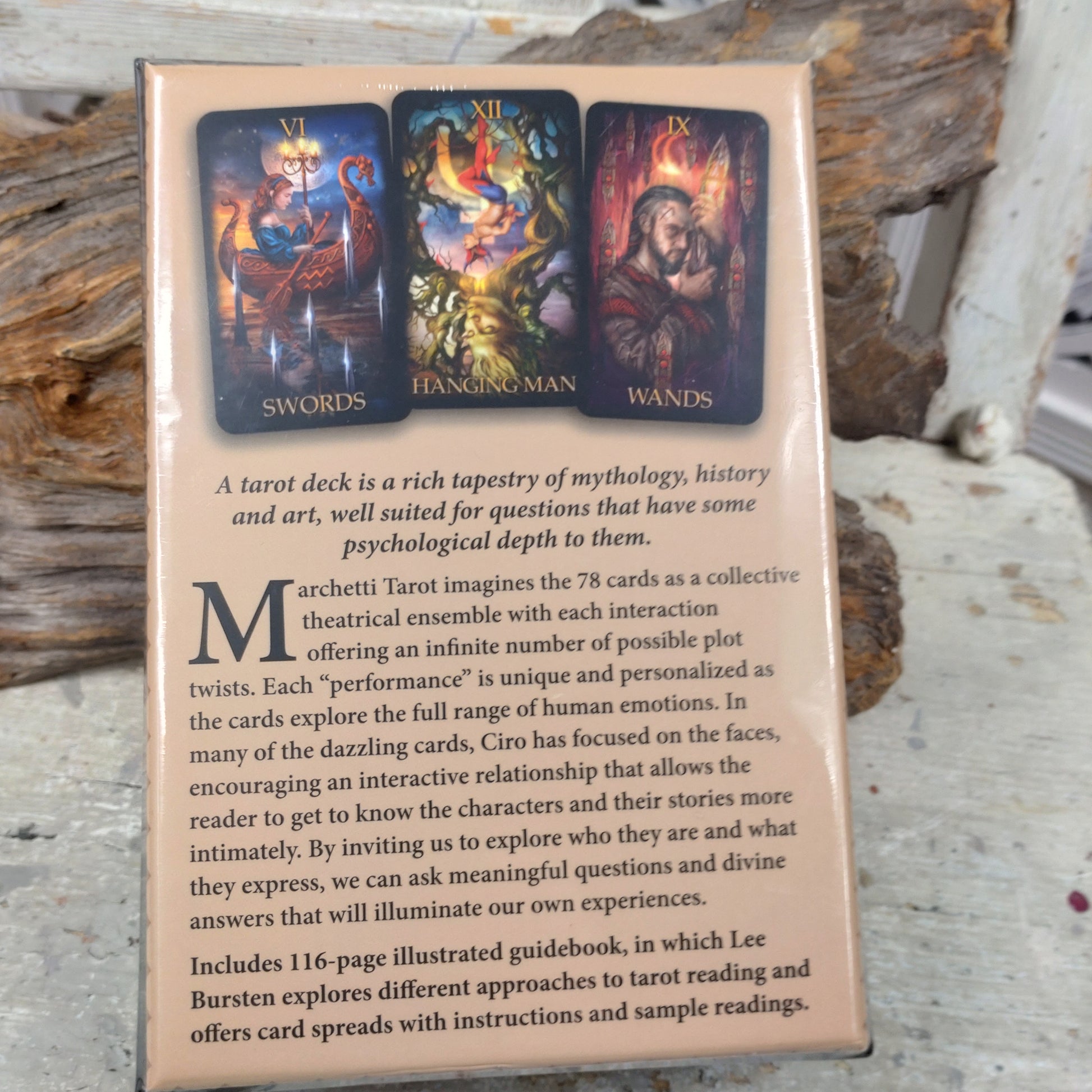 A tarot deck is a rich tapestry of mythology, history and art, well suited for questions that have some psychological depth to them. Marchetti Tarot imagines the 78 cards as a collective theatrical ensemble with each interaction offering an infinite number of possible plot twists. Each "performance" is unique and personalized as the cards explore the full range of human emotions. In many of the dazzling cards, Ciro has focused on the faces, encouraging an interactive relationship that allows the reader to get to know the characters and their stories more intimately. By inviting us to explore who they are and what they express, we can ask meaningful questions and divine answers that will illuminate our own experiences. Includes 116-page illustrated guidebook, in which Lee Bursten explores different approaches to tarot reading and offers card spreads with instructions and sample readings.